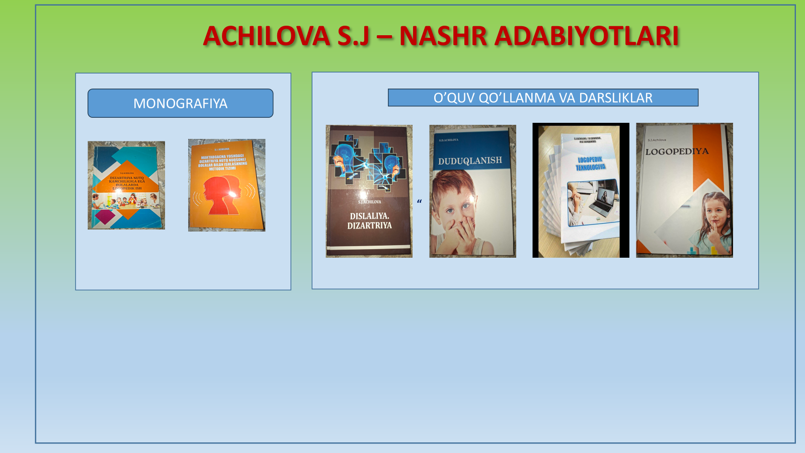 - Ачилова С.Ж. Нутқ нуқсонларни бартараф этишда қўлланиладиган логпедик методларнинг ўрни. Муғаллим илмий-методик журнал // Қорақалпоғистон, 2022, №. 5, 77-82 б.