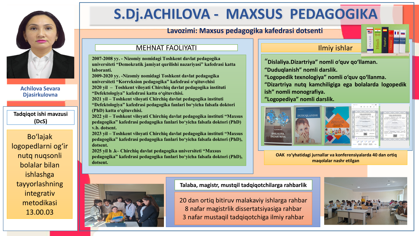 2025 yil S.Achilova rahbarligida Dehqonova M.G' “INDIVIDUAL TA’LIM SHAROITIDA BOʻLAJAKMAXSUSPEDAGOGLARNI LOGOPEDIK MASHGʻULOTLARNI MODELLASHTIRISHGA TAYYORLASH METODIKASI” mavzusida Pedagogika fanlari bo‘yicha falsafa doktori (PhD) dissertatsiyasi himoya qildi. 2025 yil 11 iyulda Pedagogika fanlari bo‘yicha falsafa doktori (PhD) diplomini oldi.