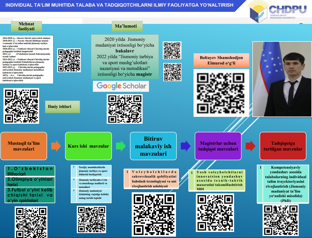 19. Boltayev Shamshodjon, Mutalibxonov Xasan VOLEYBOL SPORT TURI MISOLIDA BO’LAJAK JISMONIY TARBIYA O‘QITUVCHILARINING KASBIY FAOLIYATLARIDA INNOVATSION KLASTER METODINI QO’LLASH SAMARADORLIGI “O‘zbekiston davlat jismoniy tarbiya va sport universiteti, “Voleybol, basketbol nazariyasi va uslubiyati” kafedrasida “Sport amaliyotida maqsadli harakatlar aniqligini barqarorlashtirish” mavzusidagi xalqaro ilmiy-amaliy anjuman 2025 yil 30-may. Chirchiq.