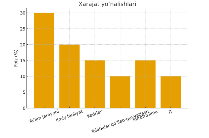 Asosiy qismi professor-o‘qituvchilar ish haqi, stipendiyalar va ijtimoiy qo‘llab-quvvatlash xarajatlariga yo‘naltiriladi.