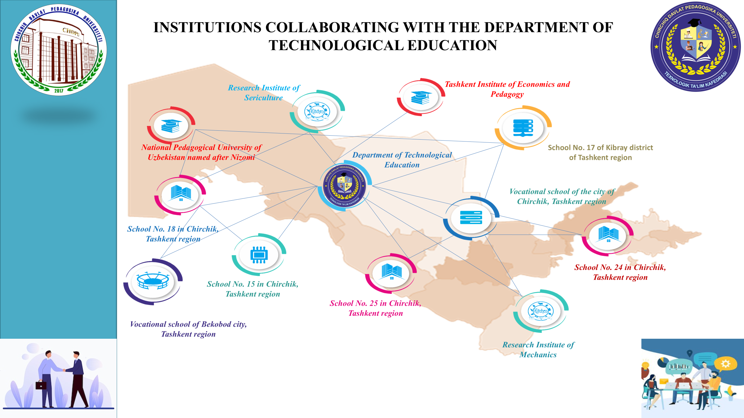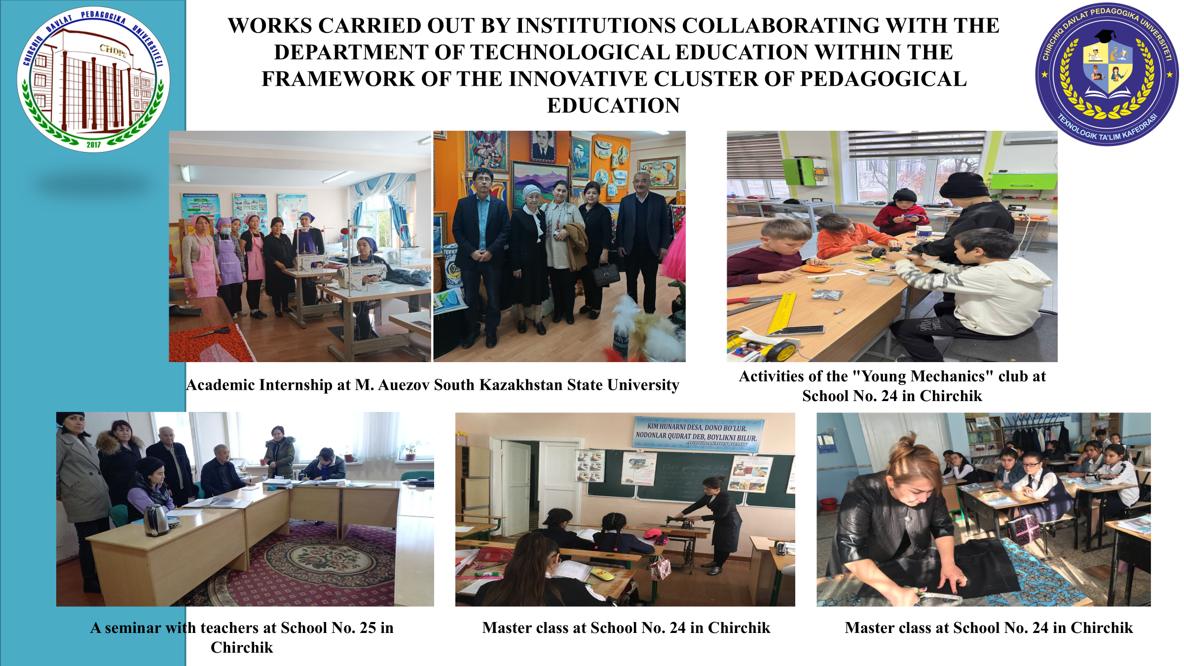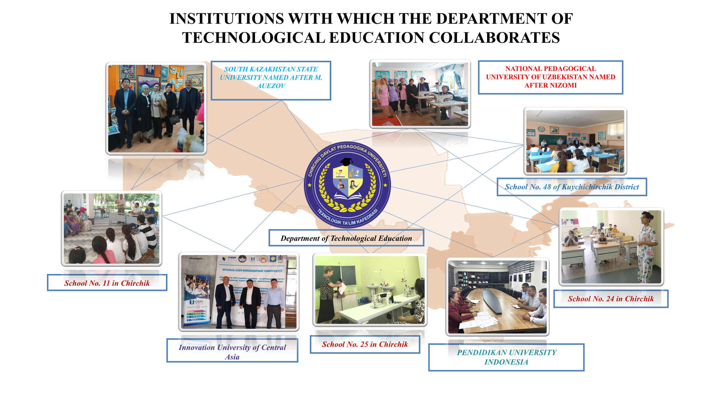 Established in 2019 at Chirchiq State Pedagogical University, the Department of Technological Education integrates national and international standards to modernize and enhance technological education programs. It offers bachelor's degree courses and conducts research focused on improving service training methodology, promoting labor education and national values, and developing management mechanisms for technological education, including ICT integration.