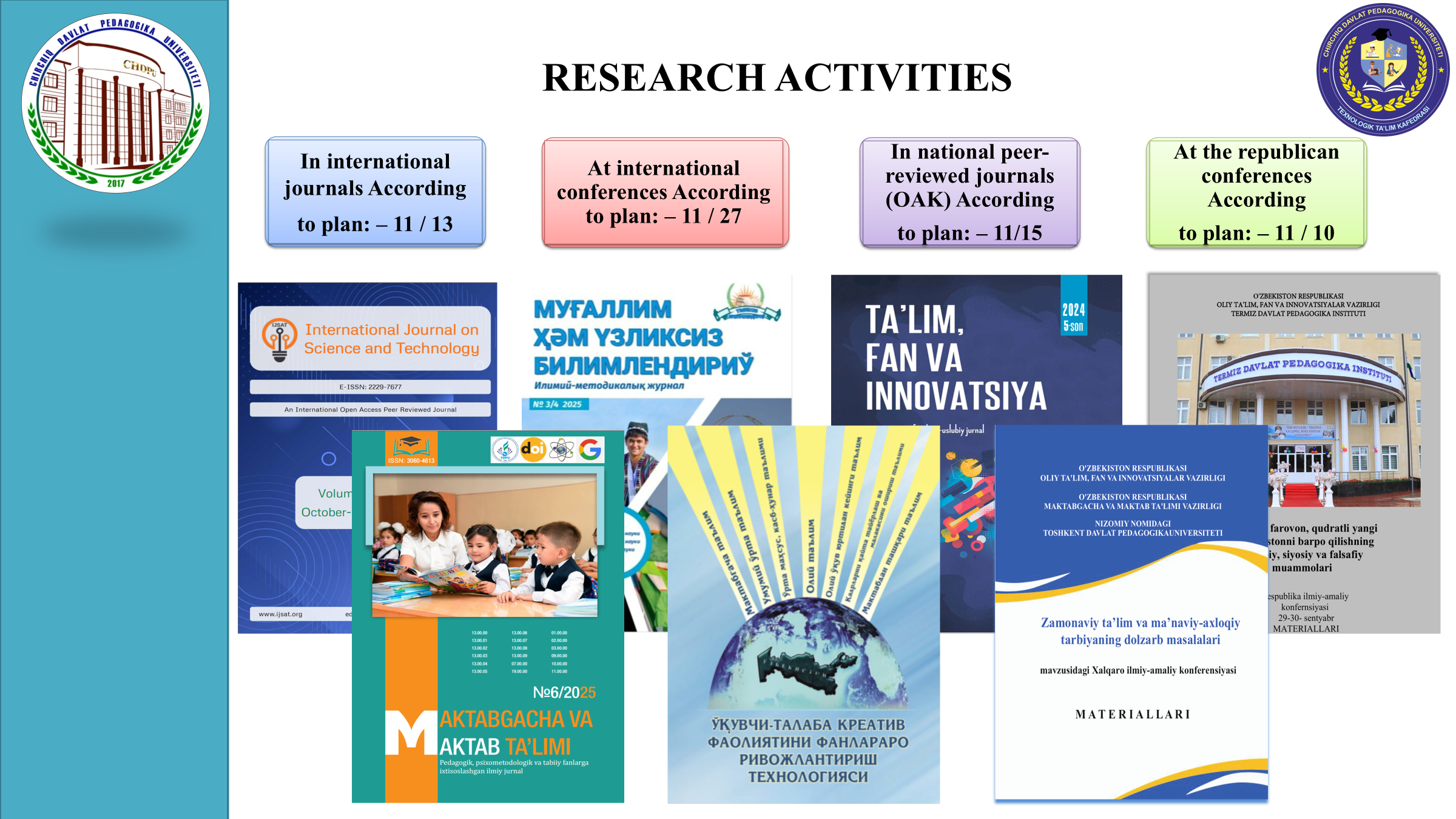 - Research on Management Mechanisms of Technological Education: A number of scientific works are being carried out on the development and improvement of technological education (ICT) in general secondary schools (K.K.Matyakubov, M.X.Sayidova). These directions contribute to enhancing the department's scientific research potential and developing new modern methodologies.