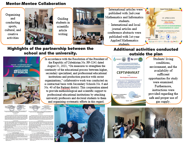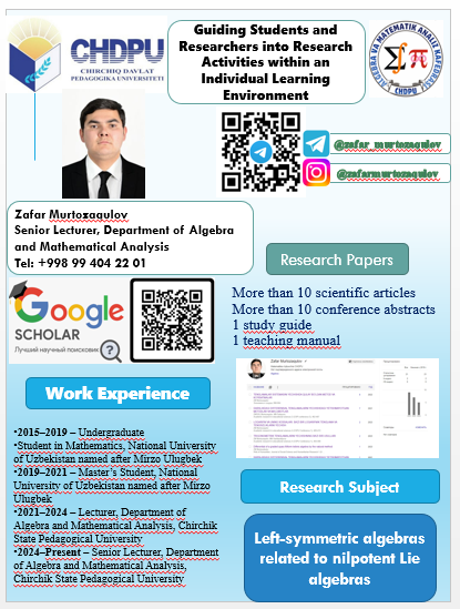 2024–Present – Senior Lecturer, Department of Algebra and Mathematical Analysis, Chirchik State Pedagogical University