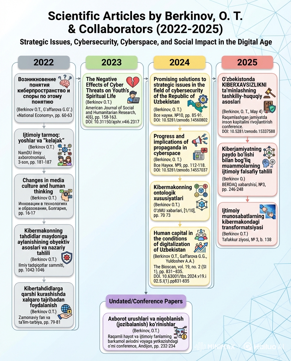 2. Berkinov O.T Kibermakonda xavfsiz muhitni ta'minlash: davlatlar tajribasi / Monografiya. -T.: Chirchiq: «Zebo prints», 2025. – 184 bet.