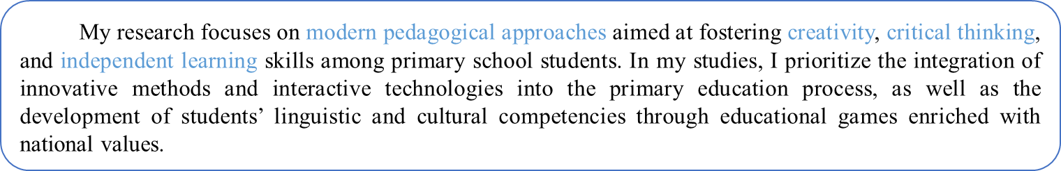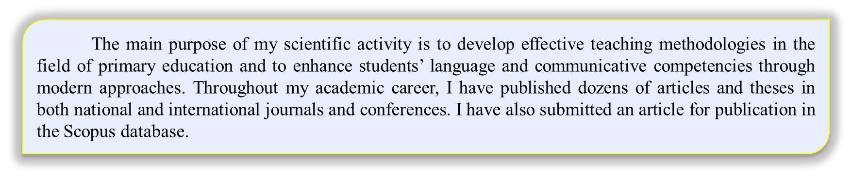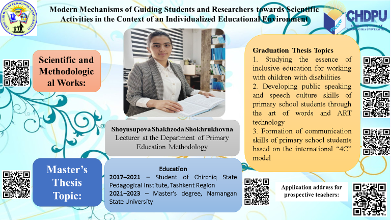 Since 2024 | Lecturer at the Department of Primary Education Methodology, Chirchik State Pedagogical University. |