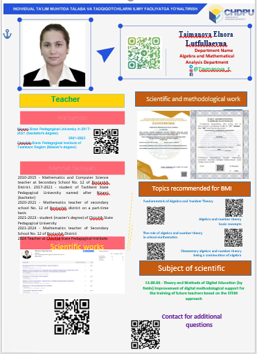 Conducting scientific research in the field of algebra and supporting students in this field is my main activity. My research on algebraic structures and their properties allows me to study this interesting field of mathematics more deeply. Currently, I am researching problems at the intersection of linear algebra, group theory, and algebraic geometry. In the future, I plan to create innovative educational materials and interactive resources for students in algebra, as well as expand international scientific cooperation. My goal is to open the doors of science and determine effective methods of teaching the younger generation.