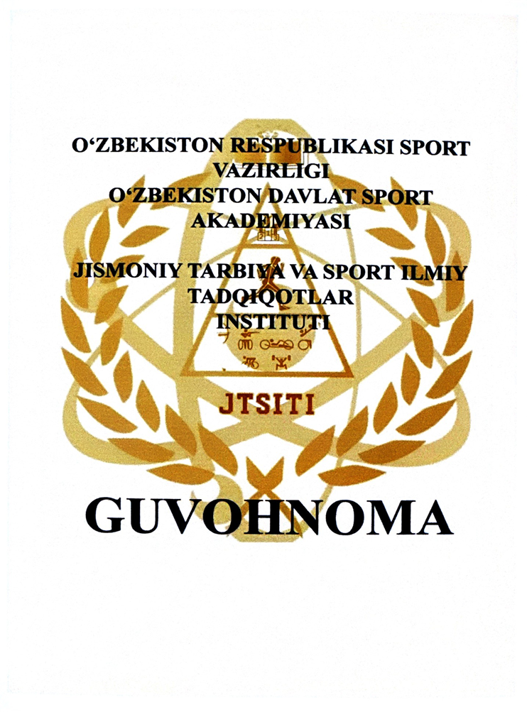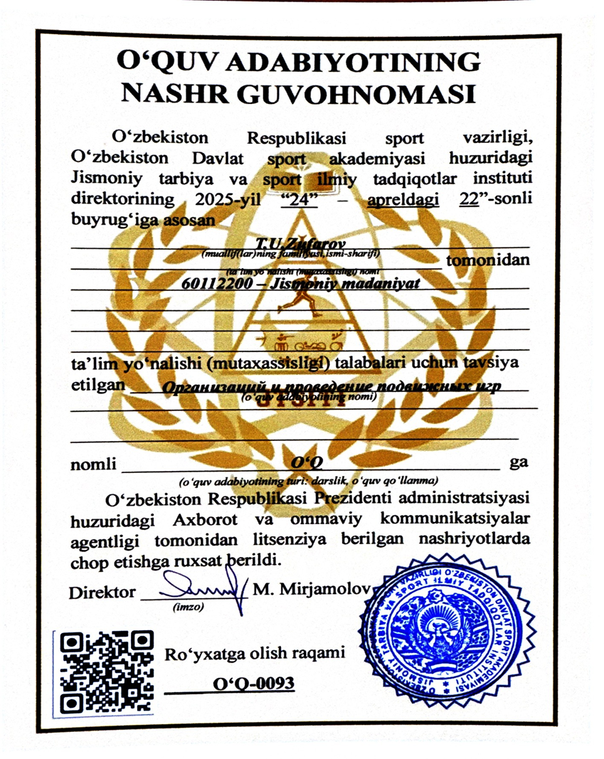1. “Формирование двигательной подготовленности у школьников младших классов с использованием подвижных игр” nomli pedagogika fanlari doktori (PhD) mavzusi Oliy attestatsiya komissiyasi «OAK Byulleteni» jurnalining 2025-yil 1-sonida e’lon qilindi. (В2022.4.PhD/Ped3976).