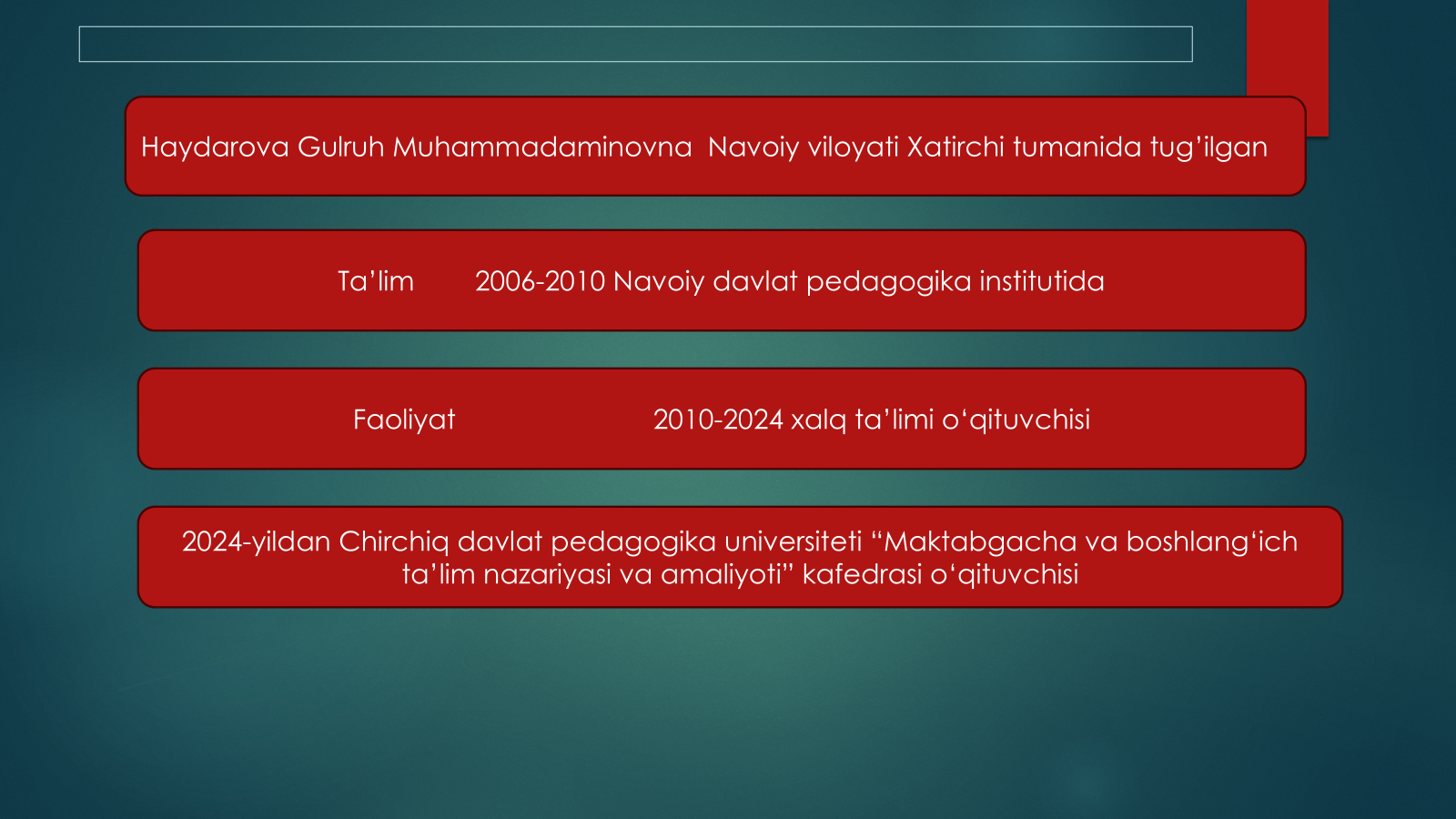 Toshkent viloyati Chirchiq davlat pedagogika instituti Boshlang‘ich ta’lim fakulteti Boshlang‘ich ta’lim nazariyasi va amaliyoti kafedrasi o‘qituvchisi Haydarova Gulruh Muhammadaminovnaning 2025-yildagi ilmiy ishlari