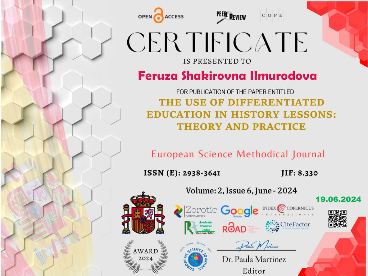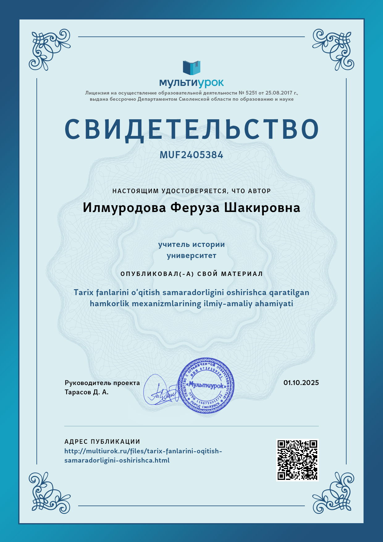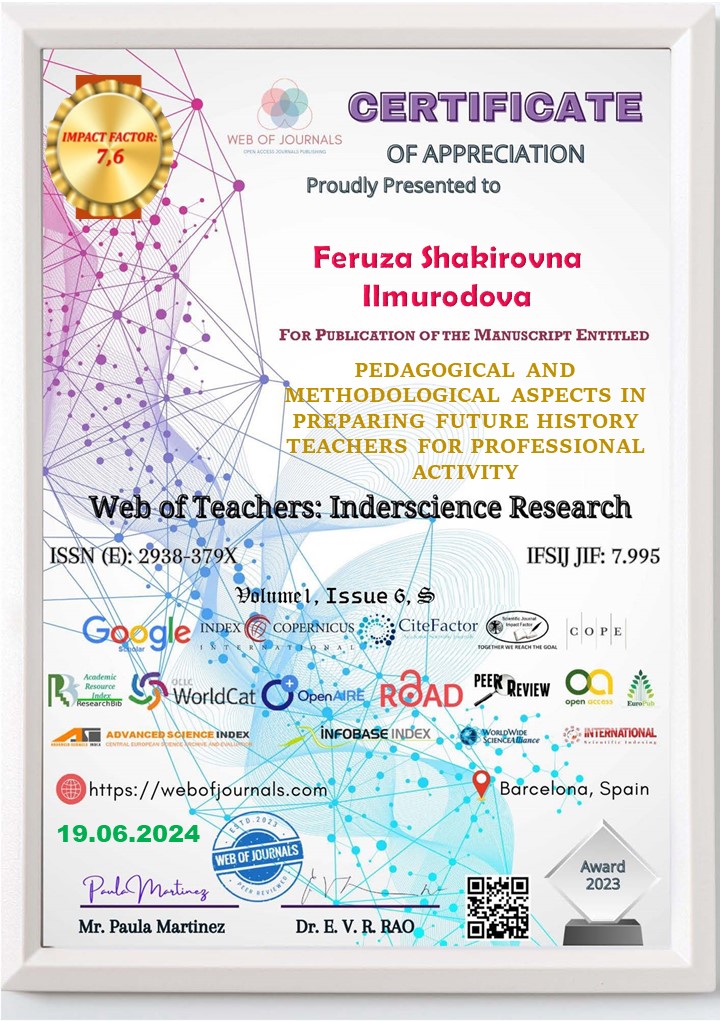 Ilmurodova Feruza Shakirovna is a history teacher specializing in history education and the methodological preparation of future teachers in Uzbekistan
