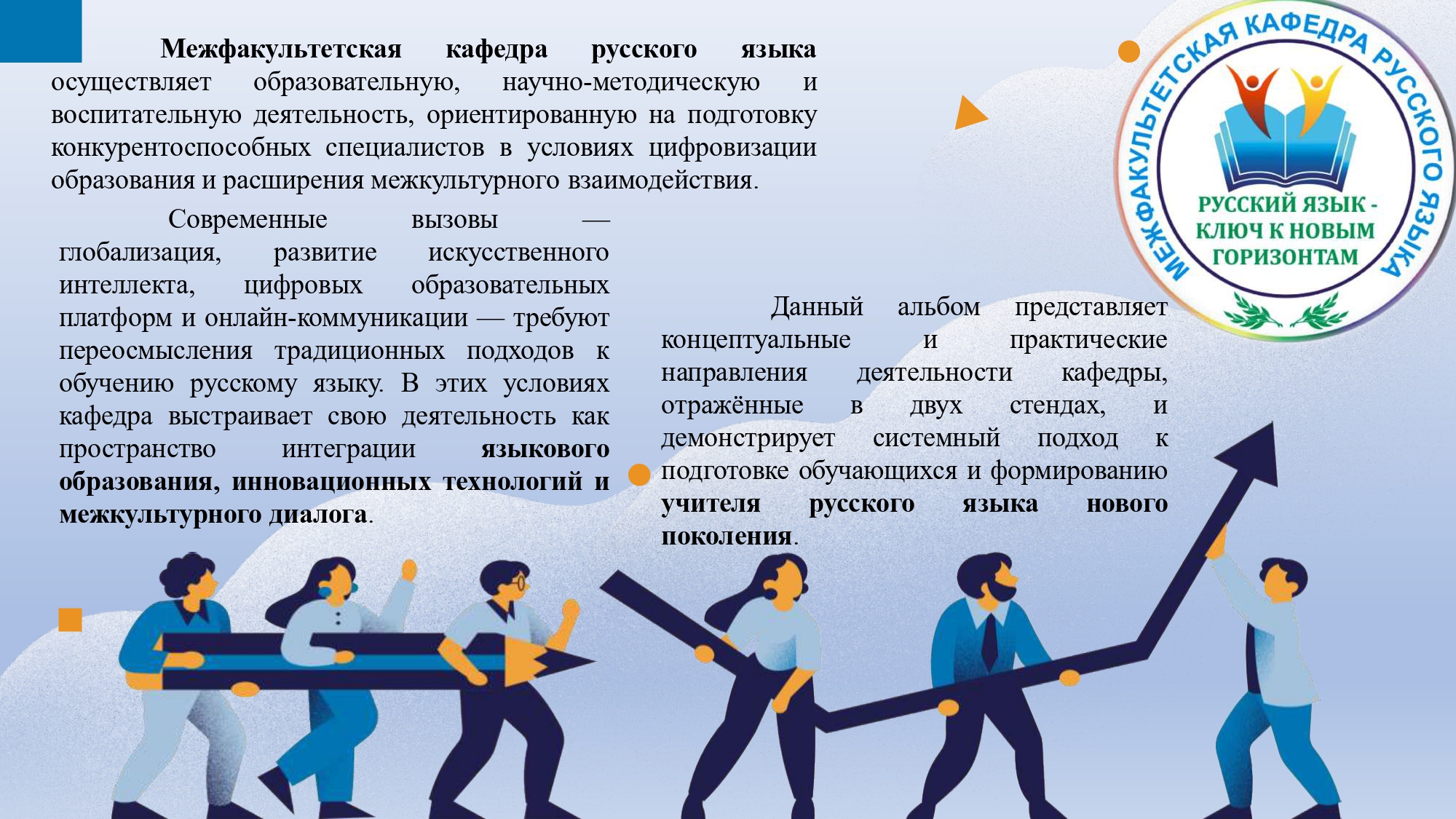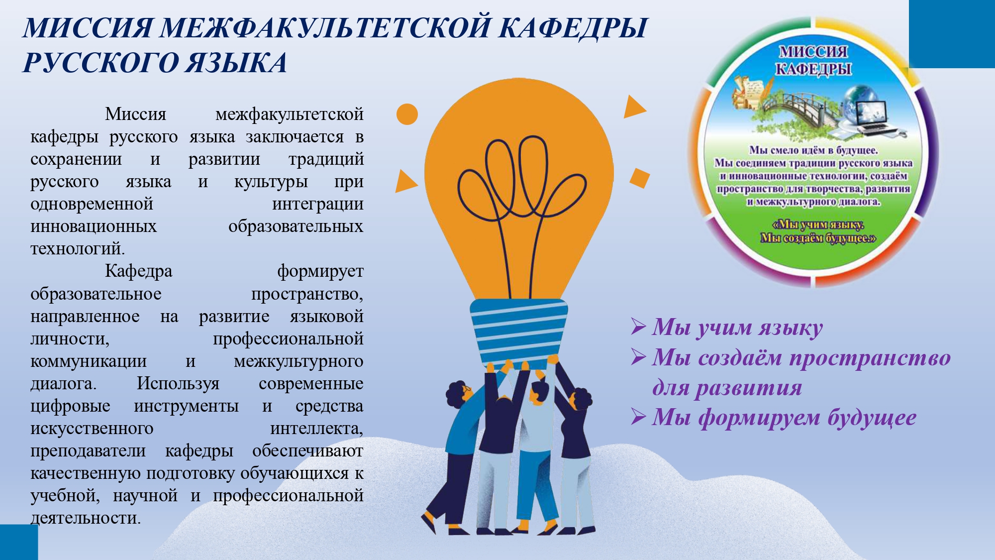 Kafedraning missiyasi: Fakultetlararo rus tili kafedrasining asosiy vazifasi talabalarning ilg‘or rus tili ko‘nikmalarini rivojlantirish hamda madaniyatlararo muloqot kompetensiyasini shakllantirishdan iborat.