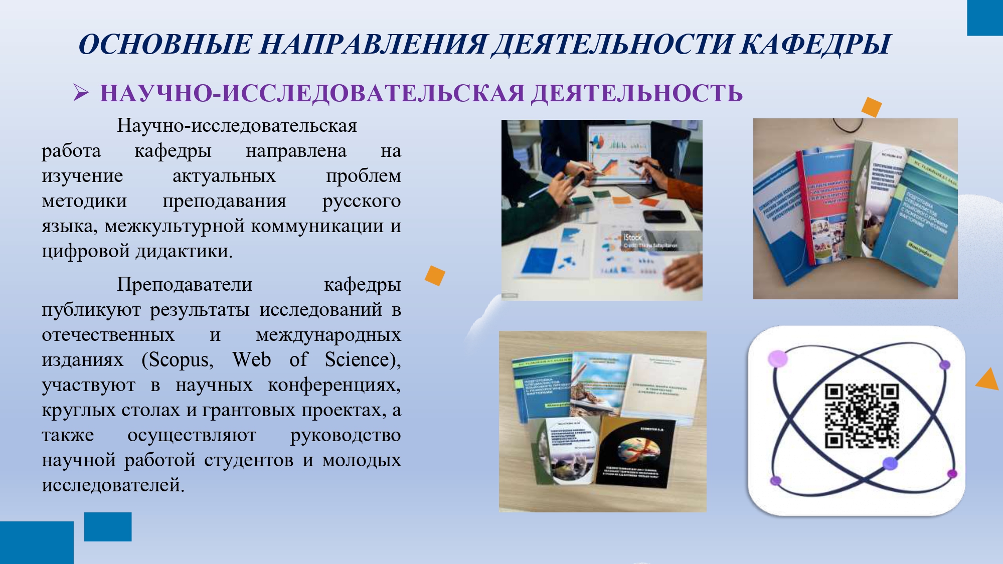 Oflayn va onlayn seminarlar: Kafedra o‘qituvchilari tomonidan o‘qituvchilar va o‘quvchilar uchun doimiy ravishda seminarlar va mahorat darslari tashkil etilmoqda. Bu tadbirlar zamonaviy lingvodidaktik yondashuvlarni targ‘ib qilish, rus tilini o‘qitishning innovatsion metodlarini amaliyotga tatbiq etish hamda ta’lim sifatini oshirishga qaratilgan.
