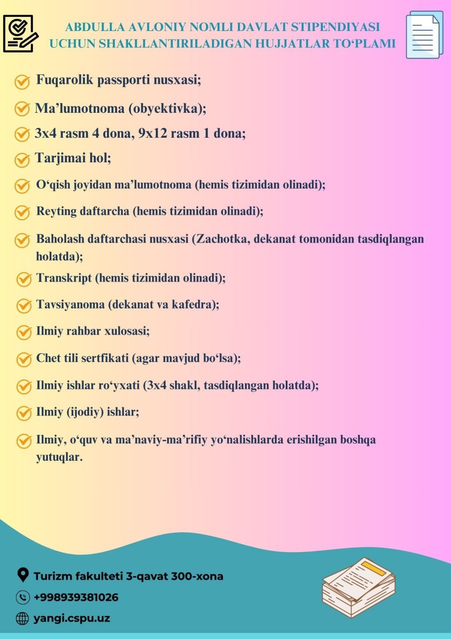 2.4. Stipendiyalarga talabgorlar dastlabki ko‘rib chiqish uchun fakultet kengashiga quyidagilarni taqdim qiladilar: