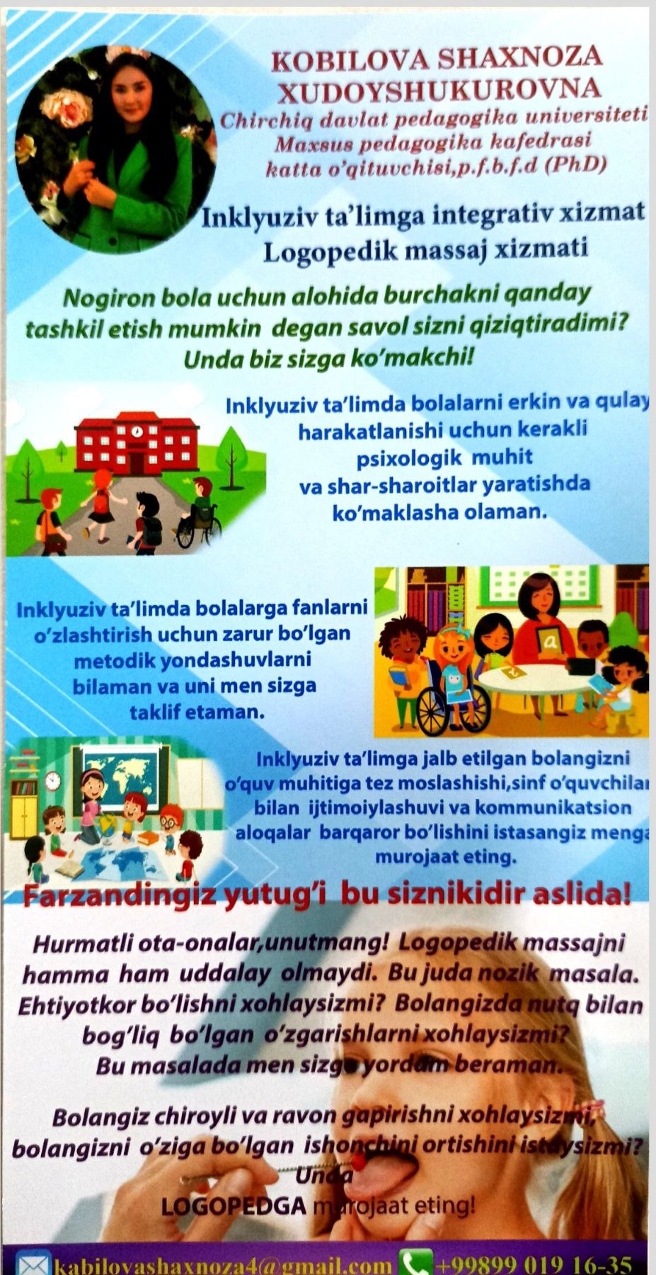 2021-2022 yillarda Toshkent viloyati Chirchiq davlat pedagogika instituti Pedagogika fakulteti Defektologiya kafedrasi magistranti va defektologiya kafedrasi tashqi o‘rindosh o‘qituvchisi.