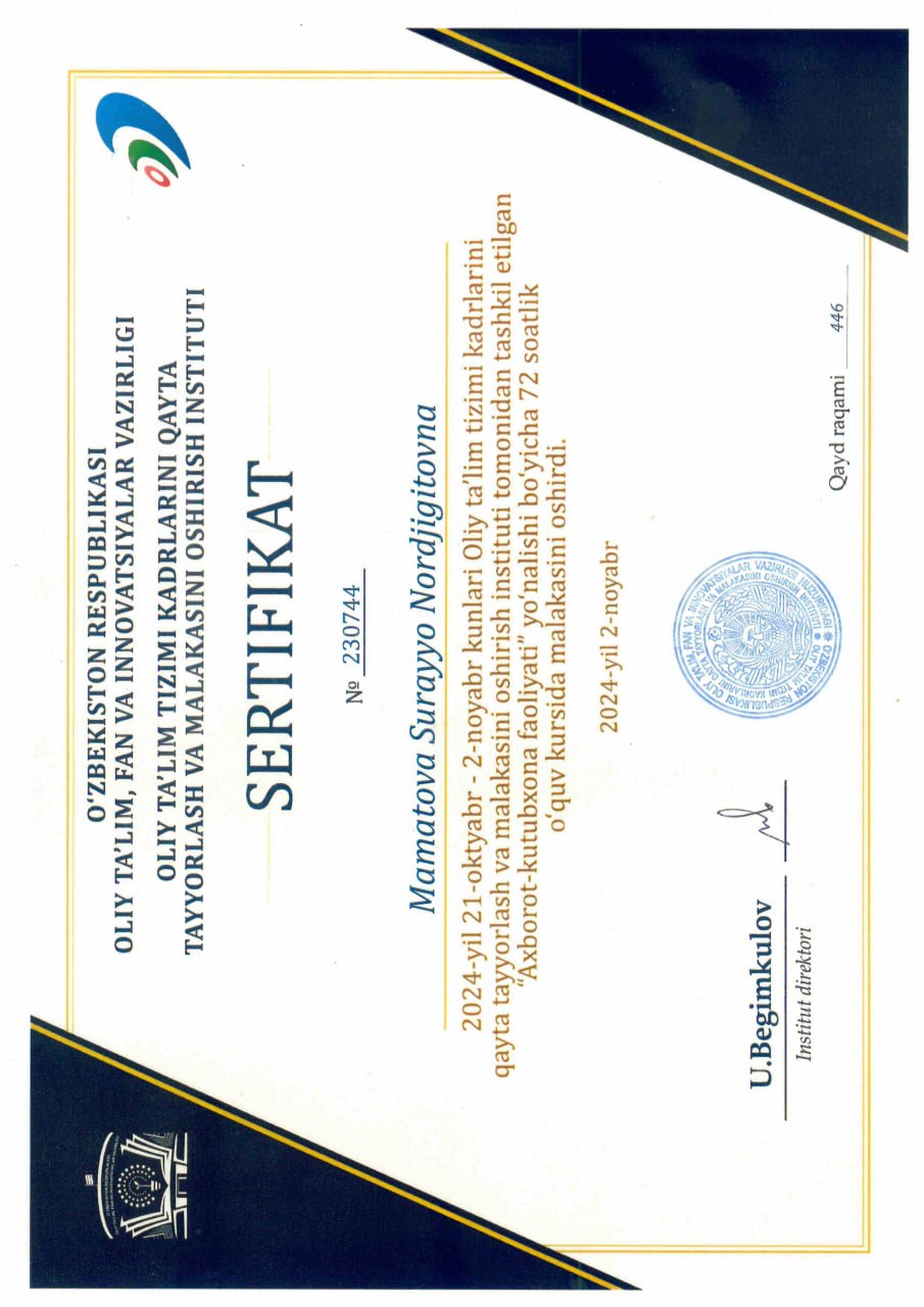 Elektron pochta:mamatova-surayyo-nordjigitovna@cspu.uz