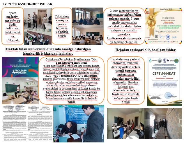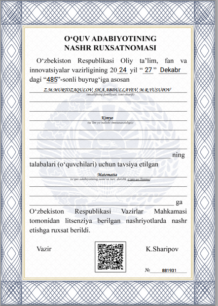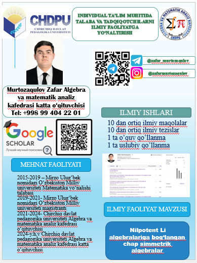2024 y.-h.v.- Chirchiq davlat pedagogika universiteti Аlgebra va matematik analiz kafedrasi katta o'qituvchisi.