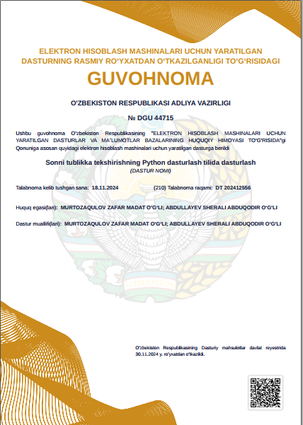 2019-2021 yy. - Mirzo-Ulug'bek nomidagi O'zbekiston Milliy universiteti matematika fakulteti matematika yo'nalishi magistratura talabasi.