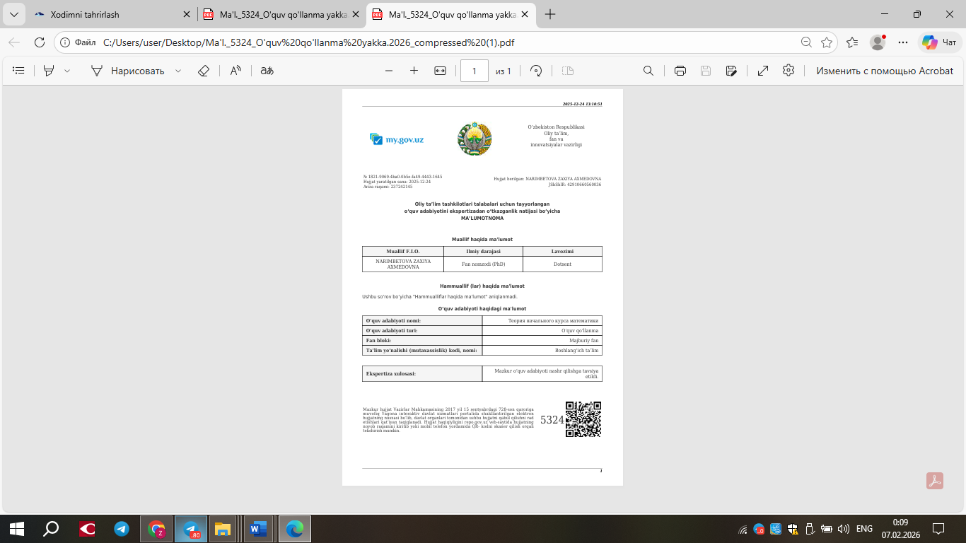5 | Методика преподования математики | nashr | Ўқув қўлланма nashr рухсатномаси 232-635.2023.29-май | (100 %) |