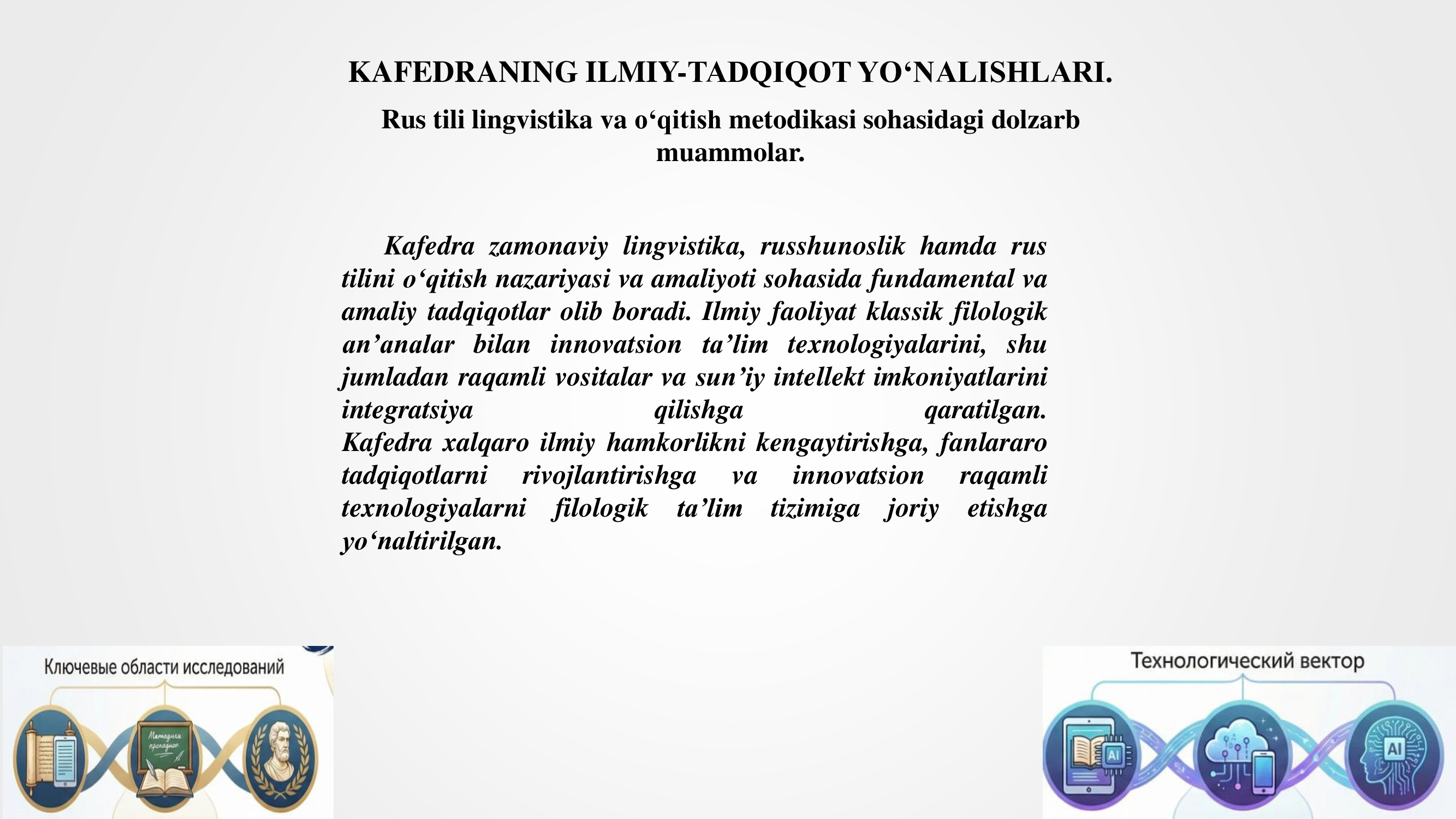 Kafedraning asosiy ilmiy-pedagogik faoliyat yo‘nalishlari zamonaviy rus adabiy tilini (fonetika va fonologiya, leksikologiya, morfemika va so‘z yasash, morfologiya va sintaksis), stilistika va nutq madaniyati, sotsiolingvistika, rus tilini o‘qitish metodikasini qamrab oladi. Maxsus e’tibor ko‘p tillilik va madaniyatlararo muhitda rus tilining funksiyalanishini, til normalarining dinamikasini va zamonaviy jamiyatdagi nutq jarayonlarini o‘rganishga qaratilgan. Kelajakdagi rus tili o‘qituvchilarini tayyorlash zamonaviy ta’lim yondashuvlari va o‘qitish texnologiyalariga, talabalar tomonidan raqamli va interaktiv didaktik resurslarni ishlab chiqish va ularni amaliyotda qo‘llash ko‘nikmalarini shakllantirishga yo‘naltirilgan.
