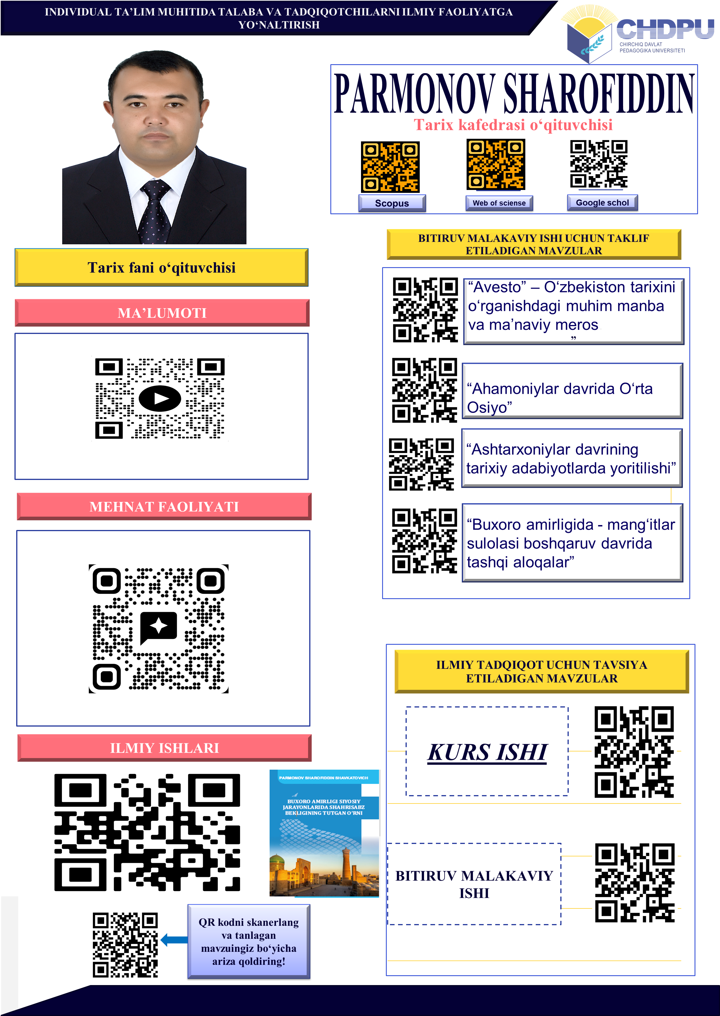 CHDPU Gumanitar fanlar fakulteti O‘zbekiston tarixi kafedrasi o‘qituvchisi