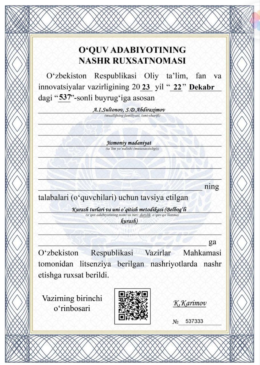 - Виды борьбы и методика её преподавания (борьба за пояс). А.И. Султанов; С.Д. Абдурахимов.