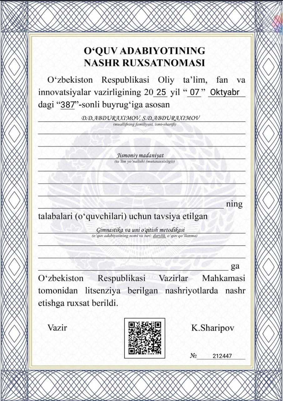 - Гимнастика и методика её преподавания. А.Д. Абдурахимов; С.Д. Абдурахимов.