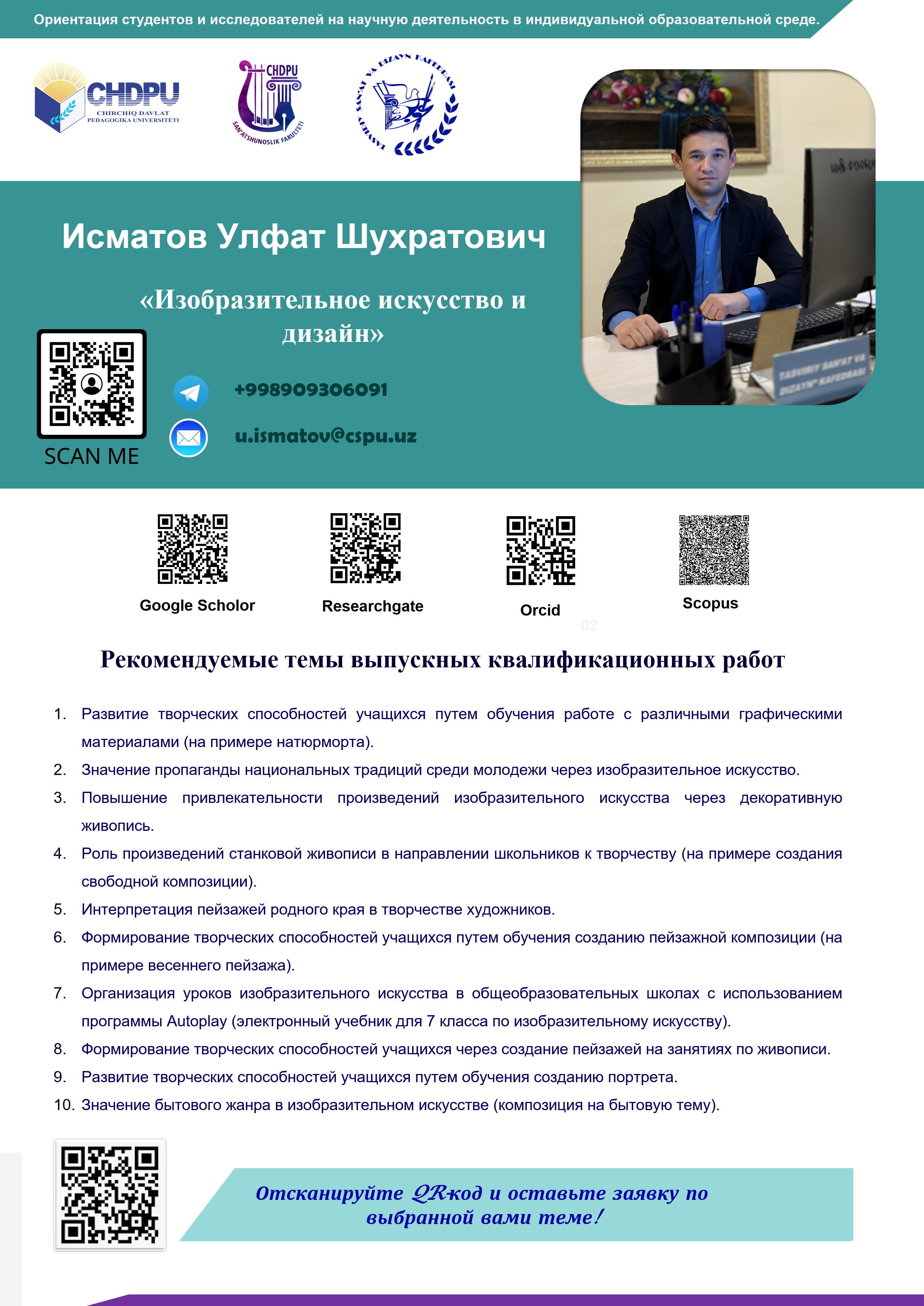С 2025 г. по настоящее время – доцент кафедры «Изобразительное искусство и дизайн» Чирчикского государственного педагогического университета.