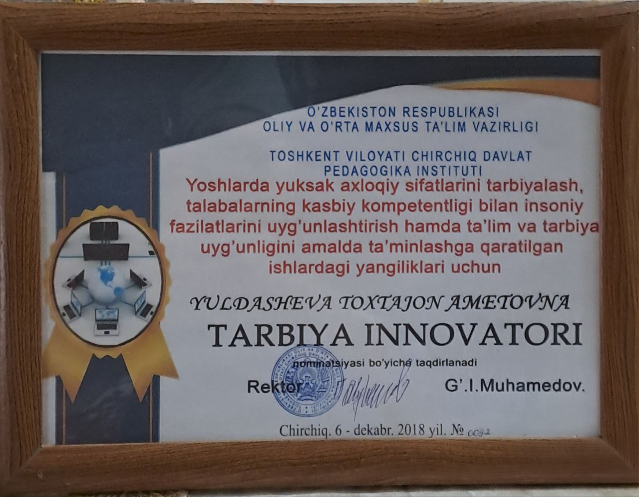 Является неотъемлемой частью коллектива Чирчикского государственного педагогического университета с 2018 года. На сегодняшний день занимает должность исполняющего обязанности доцента межфакультетской кафедры русского языка.