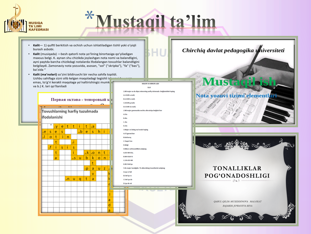 Год основания и история развития кафедры Кафедра музыки была создана 29 августа 2019 года в соответствии с Решением № 1 Совета Чирчикского государственного педагогического института Ташкентской области, выделившись из состава кафедры «Музыкальное образование» в рамках факультета «Педагогика».