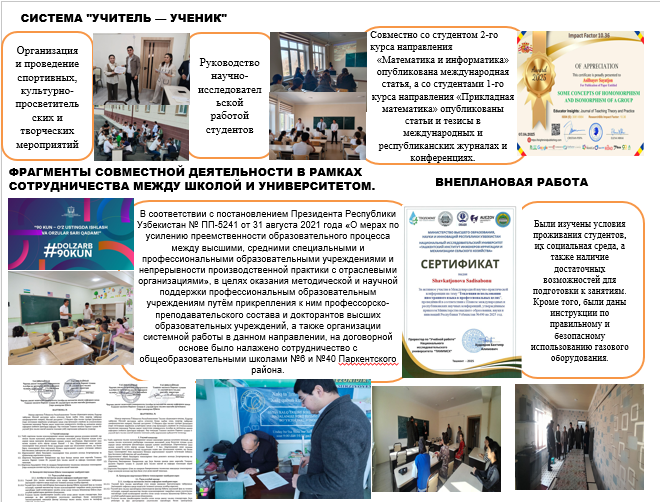 2021–2024 гг. — Преподаватель кафедры алгебры и математического анализа Чирчикского государственного педагогического университета.