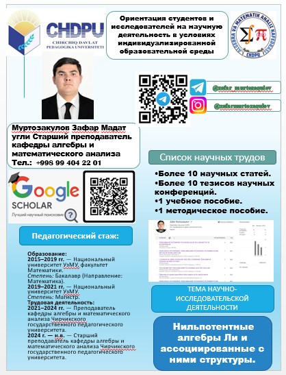 Старший преподаватель кафедры алгебры и математического анализа. Веду научную деятельность по специальности 01.01.06 — Алгебра. Основным направлением моих исследований является изучение нильпотентных алгебр Ли. Тема моей научной работы: «Левосимметричные алгебры, связанные с нильпотентными алгебрами Ли». Наряду с этим, занимаюсь написанием научных статей по внедрению цифровых технологий в систему образования. Моя цель на перспективу — активная деятельность в академической среде университета, углубление собственных научных результатов, подготовка молодых исследователей, а также участие в совместных научных проектах на международном уровне.