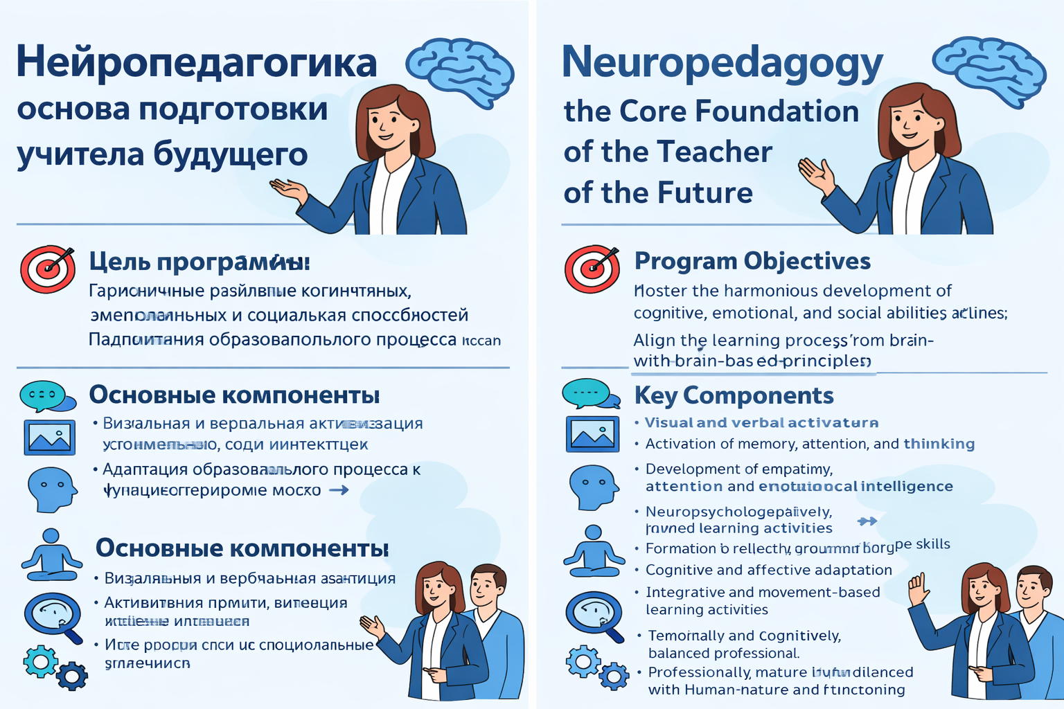 Нейропедагогика является одним из наиболее современных и естественных подходов в подготовке учителя будущего. Она обеспечивает гармонизацию образовательного процесса с деятельностью человеческого мозга. Реализация данной программы позволит подготовить педагогов нового поколения — не только носителей знаний, но и профессионалов, способных управлять познавательными процессами, развивать эмоциональный интеллект и применять когнитивно обоснованные педагогические решения. Нейропедагогическое мышление — ключевой принцип устойчивого образования XXI века.