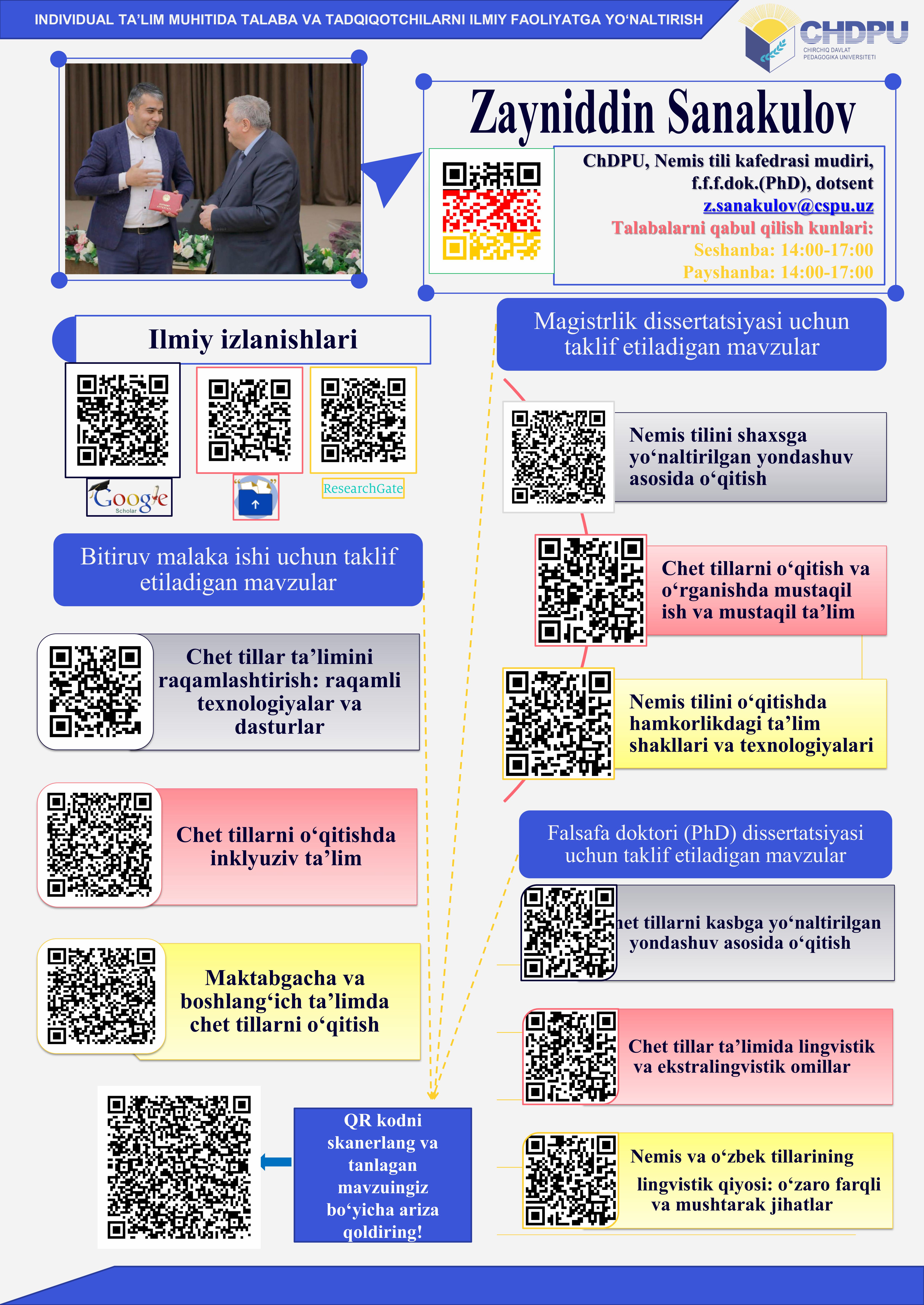 В качестве доктора наука (DSc) по педагогическим наукам мои научные исследования посвящены методике преподавания немецкого языка как иностранного, межкультурной коммуникации и сравнительному анализу немецкого и узбекского языков. В настоящее время я занимаюсь углубленным изучением лингводидактических аспектов художественной ономастики, а также развитием международных проектов сотрудничества и внедрением современных методических подходов в систему высшего образования. Важным направлением моей научной деятельности является расширение международной научно-образовательной сети университета, укрепление его престижа в глобальном образовательном пространстве и вклад в подготовку нового поколения специалистов в области германистики.