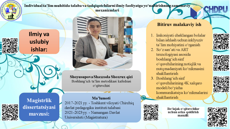 Chirchiq davlat pedagogika universiteti “Boshlang‘ich ta’lim metodikasi” kafedrasi o‘qituvchisi