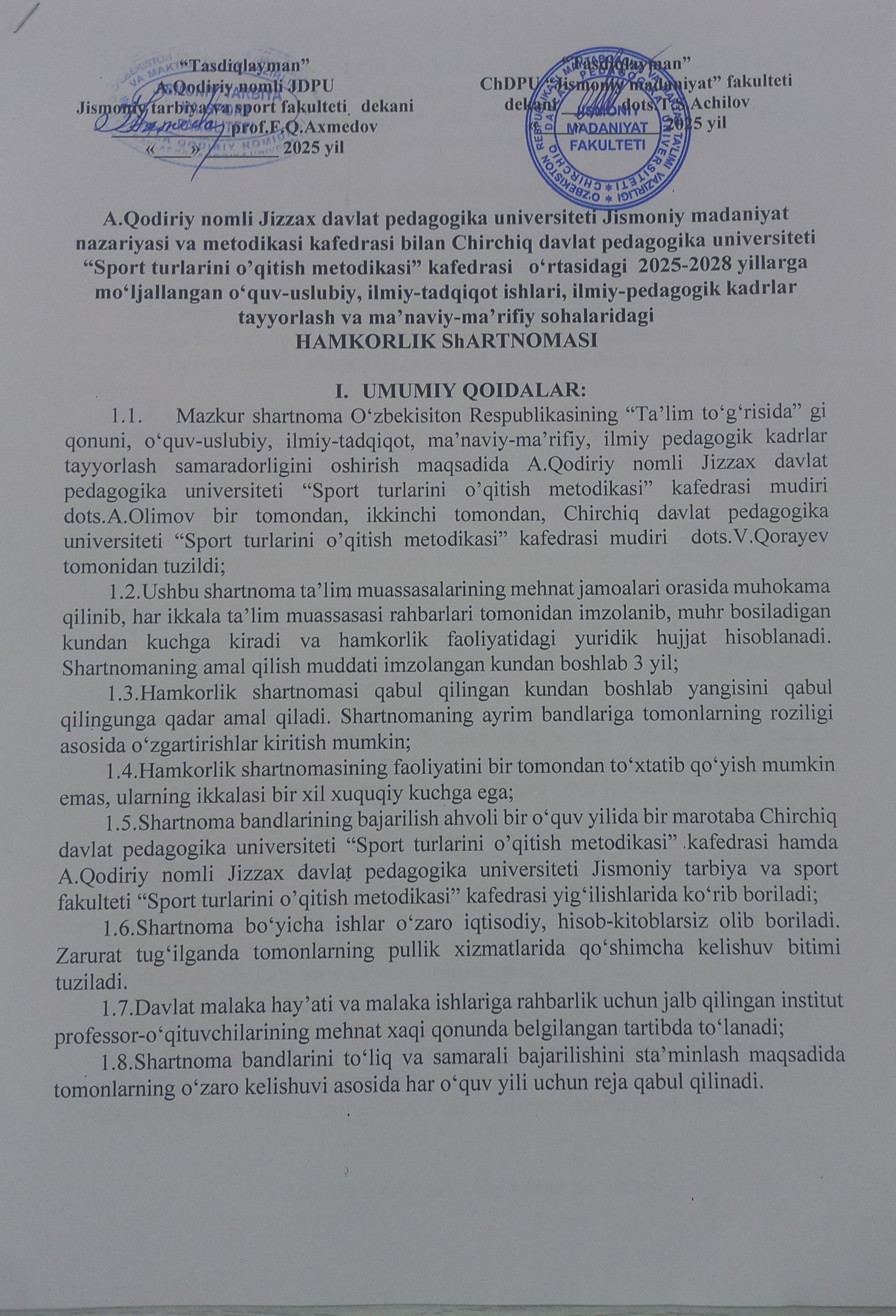 2025 yil 7 oktyabr kuni A.Qodiriy nomidagi Jizzax davlat pedagogika universiteti Jismoniy madaniyat nazariyasi va metodikasi kafedrasi bilan birgalikda 2025-2028 yillarga mo'ljallangan hamkorlik shartnomasi imzolandi.