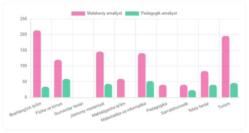 *Ma'lumot uchun izoh: Malakaviy amaliyot: 0 dan 214 gacha; Pedagogik amaliyot: 0 dan 59 gacha.*