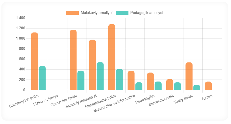 *Ma'lumot uchun izoh: Malakaviy amaliyot: 165 dan 1281 gacha; Pedagogik amaliyot: 0 dan 542 gacha.*
