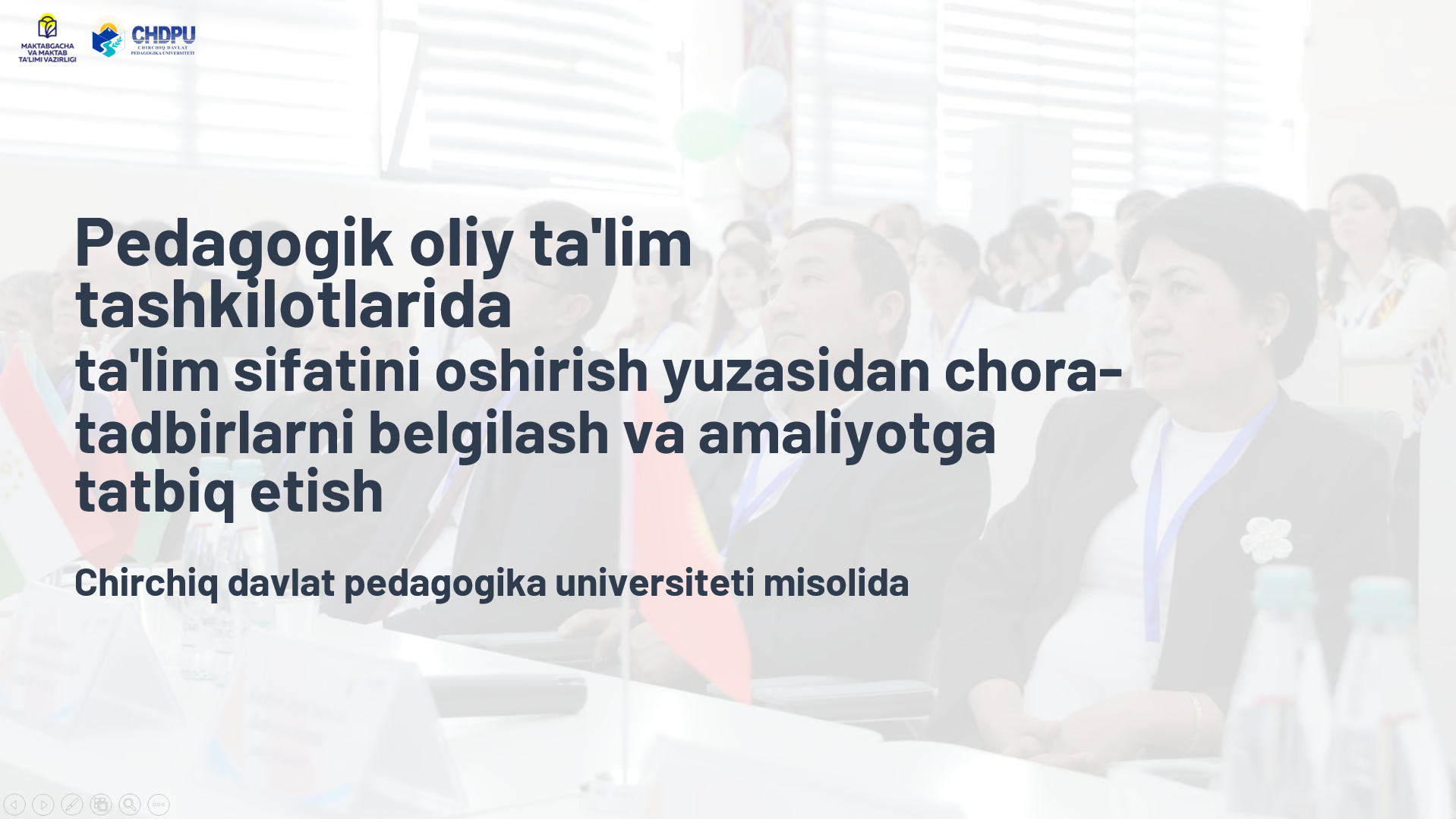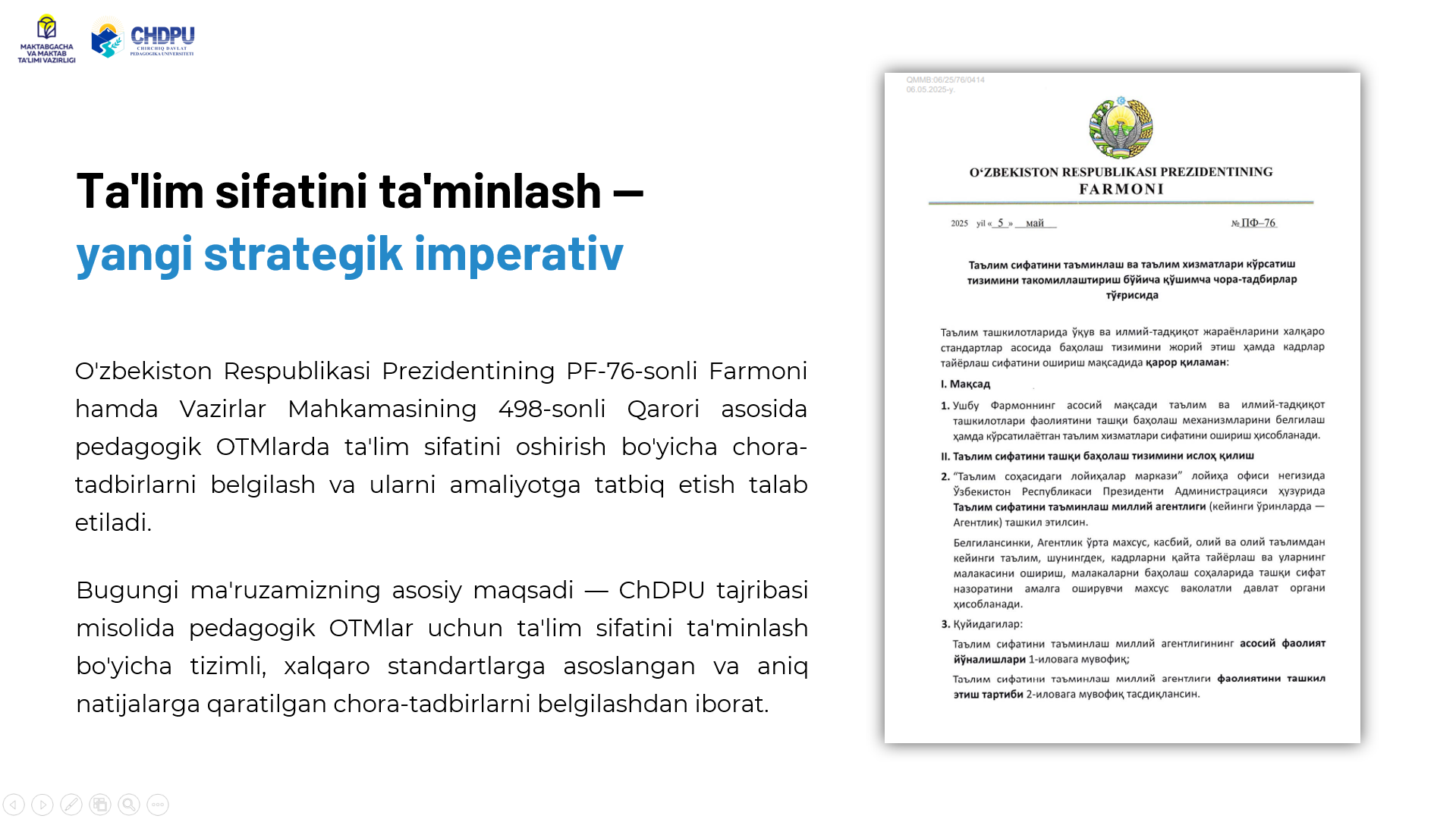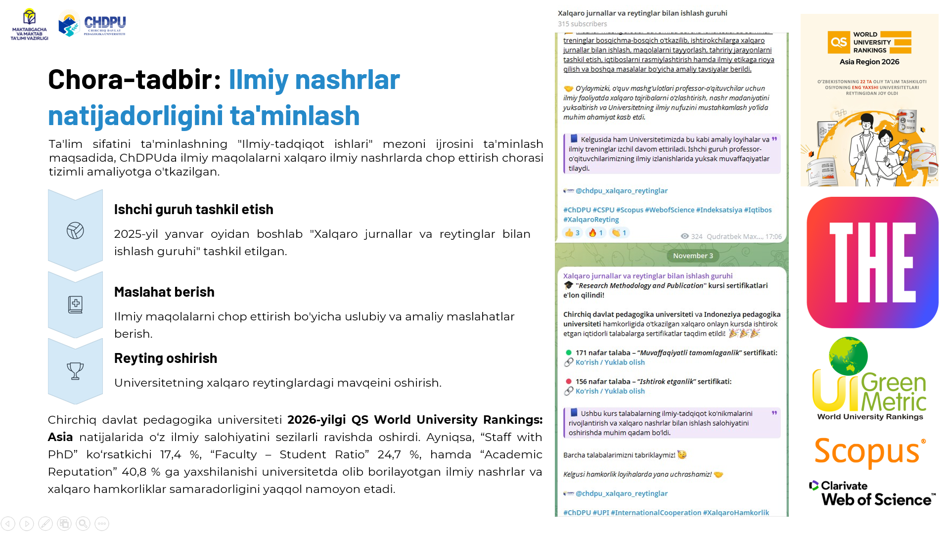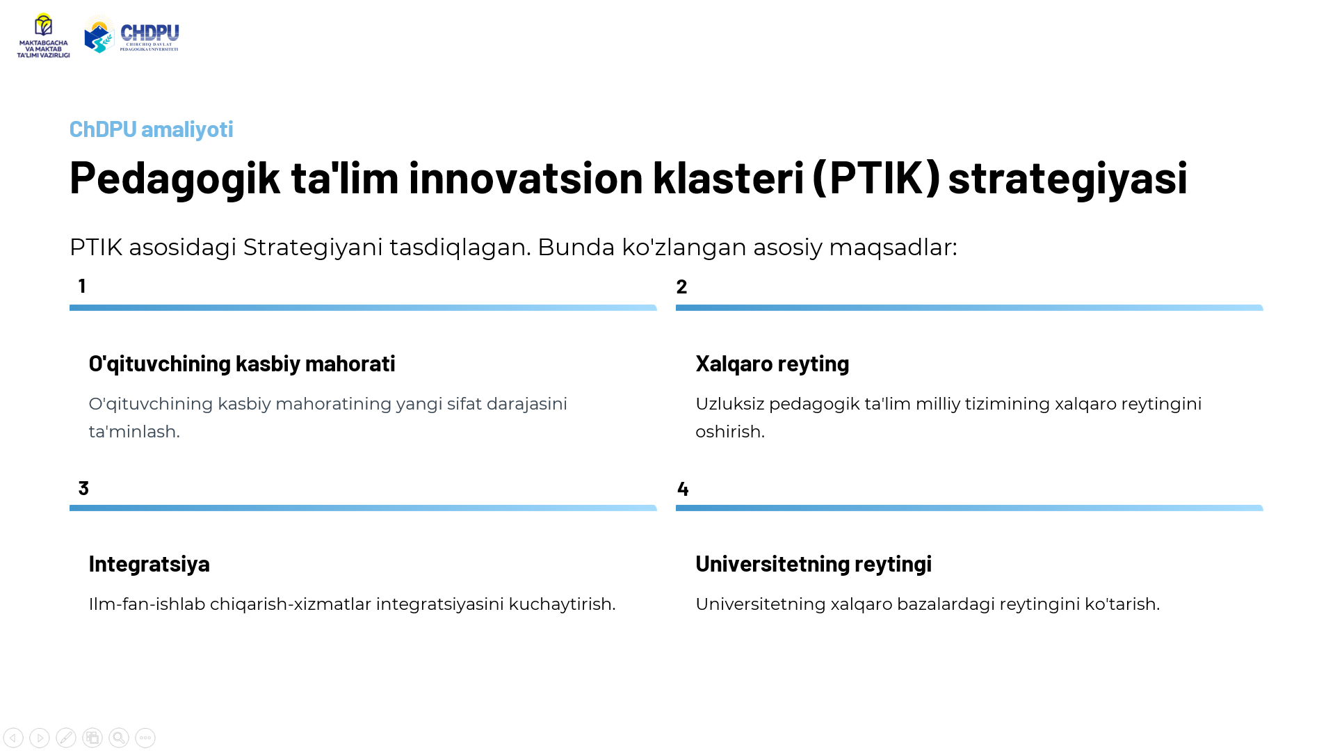 Pedagogik oliy ta'lim tashkilotlarida ta'lim sifatini oshirish yuzasidan chora-tadbirlarni belgilash va amaliyotga tatbiq etish Kategoriyalar: E'lonlar Chop etilgan sana: 25 ноябр 2025 20:54 Ko'rishlar: 11 Teglar: E'lonlar Ulashish: