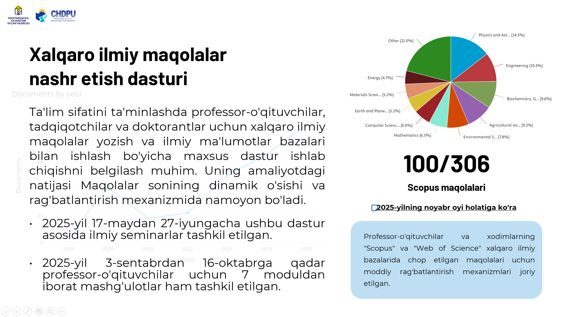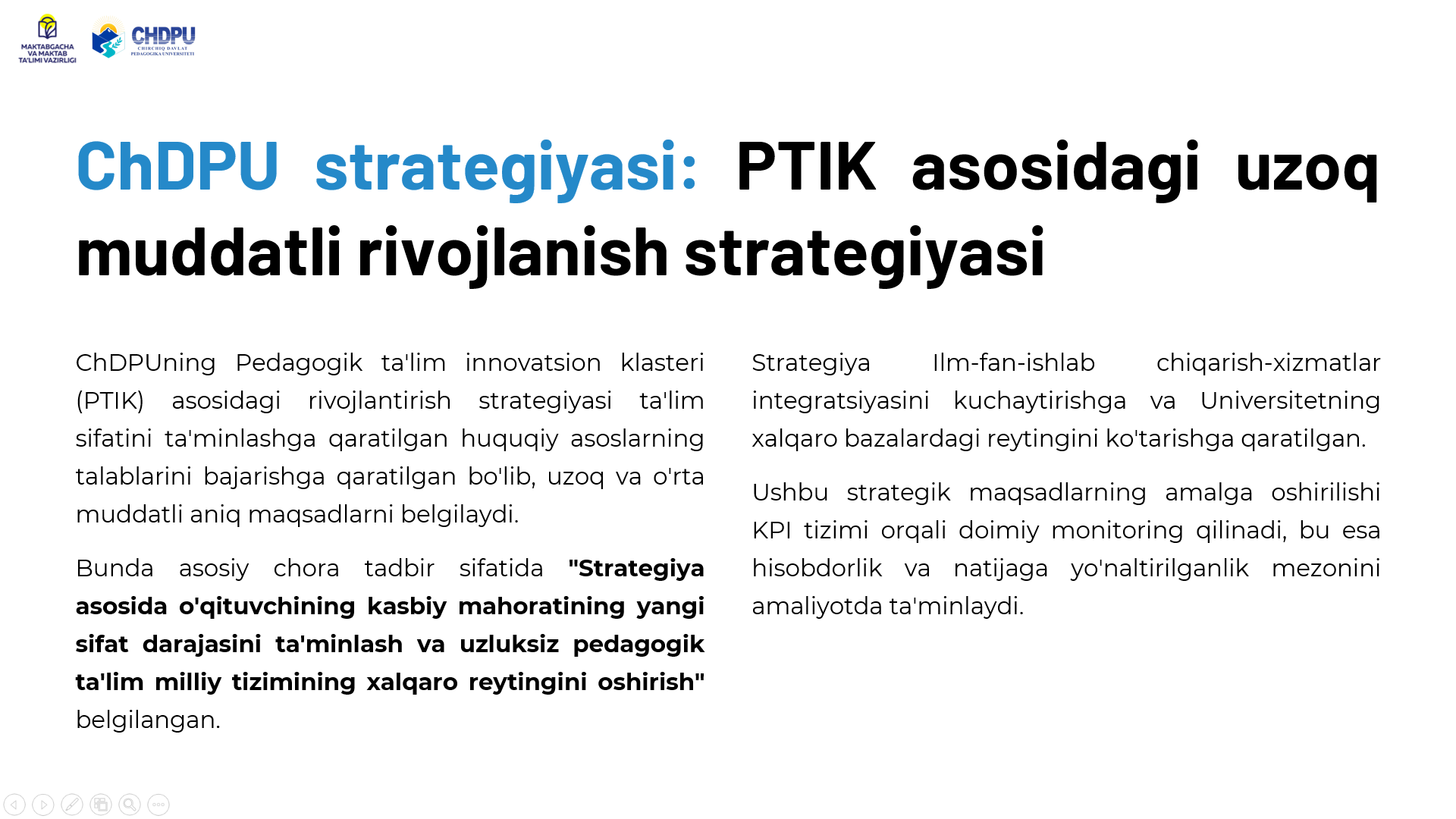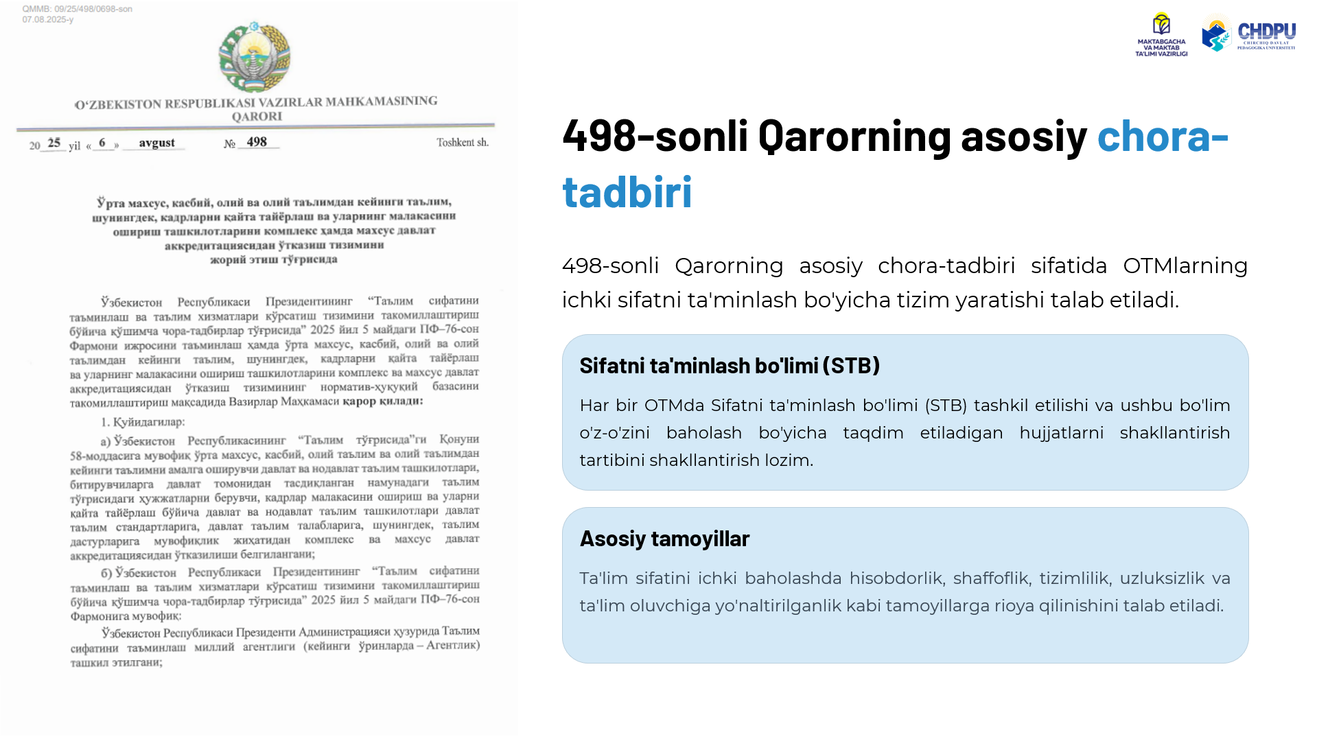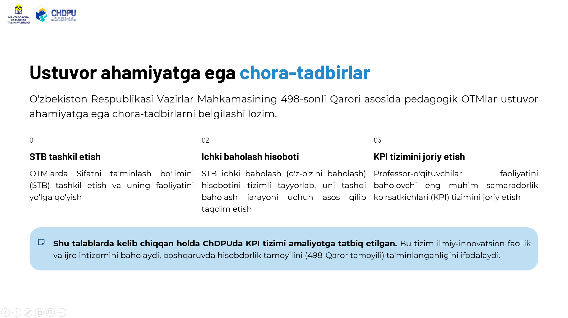 Pedagogik oliy ta'lim tashkilotlarida ta'lim sifatini oshirish yuzasidan chora-tadbirlarni belgilash va amaliyotga tatbiq etish Kategoriyalar: E'lonlar Chop etilgan sana: 25 ноябр 2025 20:54 Ko'rishlar: 11 Teglar: E'lonlar Ulashish: