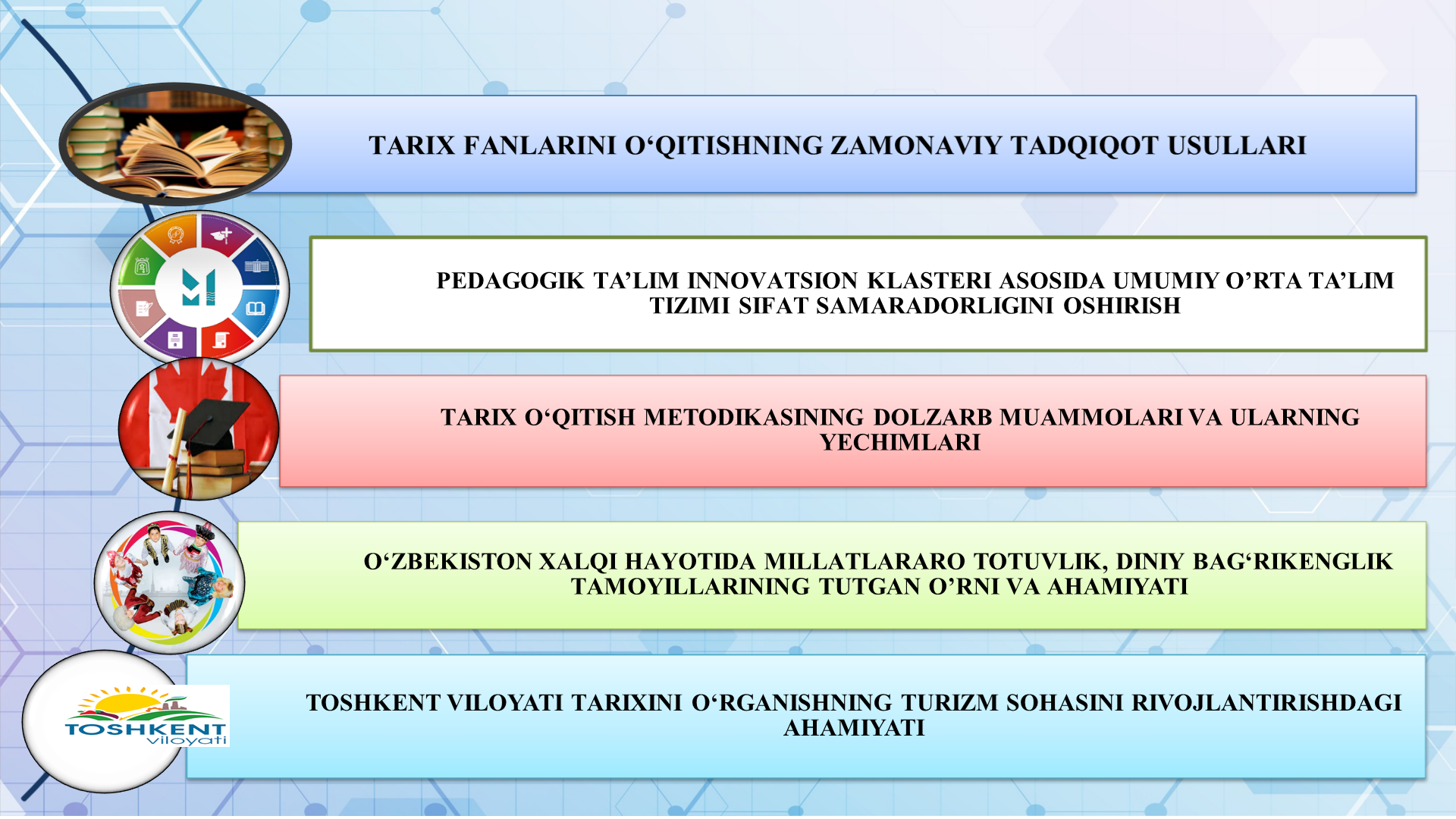 — Tarix o‘qitish metodikasi: Tarix o‘qitishda zamonaviy yondashuvlar (Y.X.G’afforov) Pedagogik ta’lim klasteri asosida tarix fanlarini o‘qitish metodikasini takomillashtirish (S.A.Toshtemirova), Talabalarda bag‘rikenglik kompetensiyasini integrativ asosda rivojlantirishning pedagogik imkoniyatlari (D.B.Ahmadjanov), Individual yondashuv asosida maktab o‘quvchilarida raqamli savodxonlikni shakllantirish mexanizmlari (Z.Haydarova), Amaliy mashg‘ulotlar asosida talabalarning kasbiy kompetentsiyasini shakllantirish metodikasi (I.S.Joldasov)
