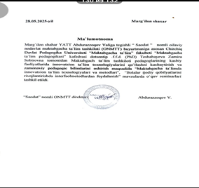 2025 yil 26 may kuni“Maktabgacha ta’lim pedagogikasi” kafedrasi tomonidan “Ta’lim, Fan, Nazariya va amaliyot” mavzusidagi ilmiy, amaliy, metodik tadbir tashkil etildi.