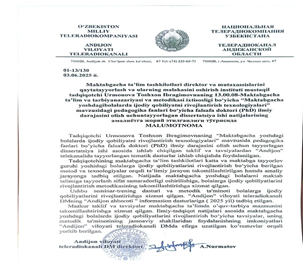 Individual ta’lim tizimida talabalarni ilmiy faoliyatga yonaltirishda talabalarning shaxsiy kompitentligini yonaltirishda “Ustoz-shogird” tizimida maqolalar chop etildi. 2.Teshabayeva Z.S. Chirchiq Davlat Pedagogika Universiteti “Maktabgacha ta’lim pedagogikasi” kafedrasi dotsenti, p,f,f,d (PhD) Normurodova S.L. Chirchiq davlat pedagogika universiteti 2-bosqich talabas“Maktabgacha ta’lim tashkiloti turli yosh guruhi tarbiyalanuvchilarida ijtimoiy munosabatlarnini shakllantirish texnologiyalari“// “МУҒАЛЛИМ ҲӘМ ҮЗЛИКСИЗ БИЛИМЛЕНДИРИЎ 2025 yil № 2 \3 son 377-381 b.