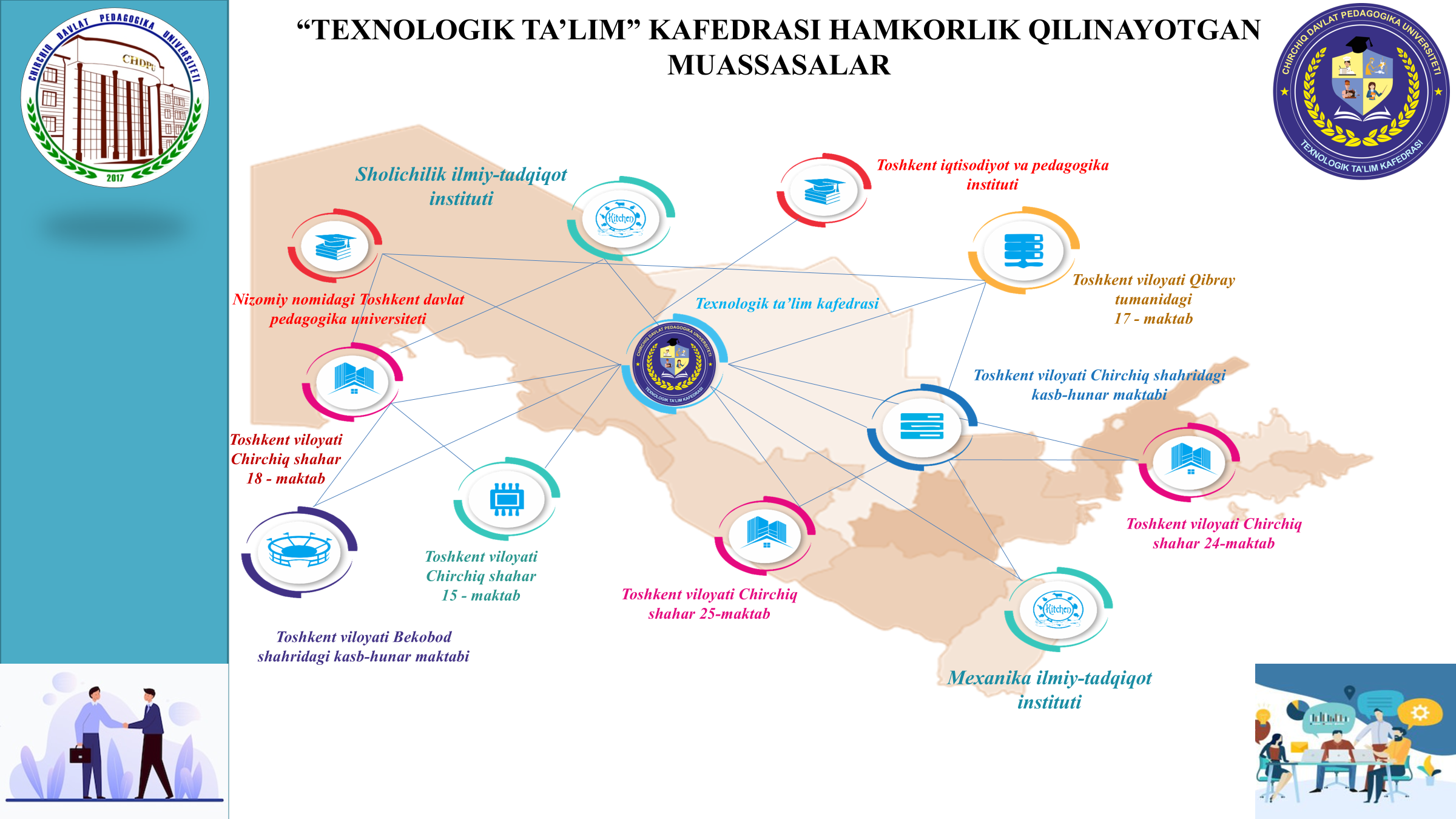 - Zamonaviy ta’lim texnologiyalari va raqamli texnologiyalar integratsiyasi asosida xalqaro pedagog imidjini shakllantirish. Texnologik ta’lim kafedrasining o‘rta muddatli strategik rivojlantirish dasturi (2022-2025 yillar uchun) amalga oshirilmoqda.