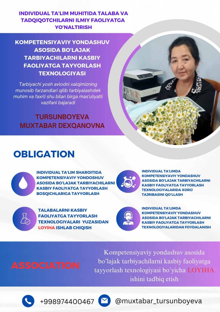 Tursunboyeva Muxtabar Dexqanovna 1967-yil 4-iyunda Toshkent viloyati Bo'stonliq tumanida tug'ilgan. Millati O'zbek. 1990y. Toshkent davlat pedagogika instituti (kunduzgi) Ma'lumoti bo'yicha mutaxassisligi: pedagogika va psixologiya o'qituvchisi! Bugungi kunda Chirchiq davlat pedagogika universiteti Maktabgacha ta'lim fakulteti Maktabgacha ta'lim pedagogikasi kafedasi katta o'qituvchisi!