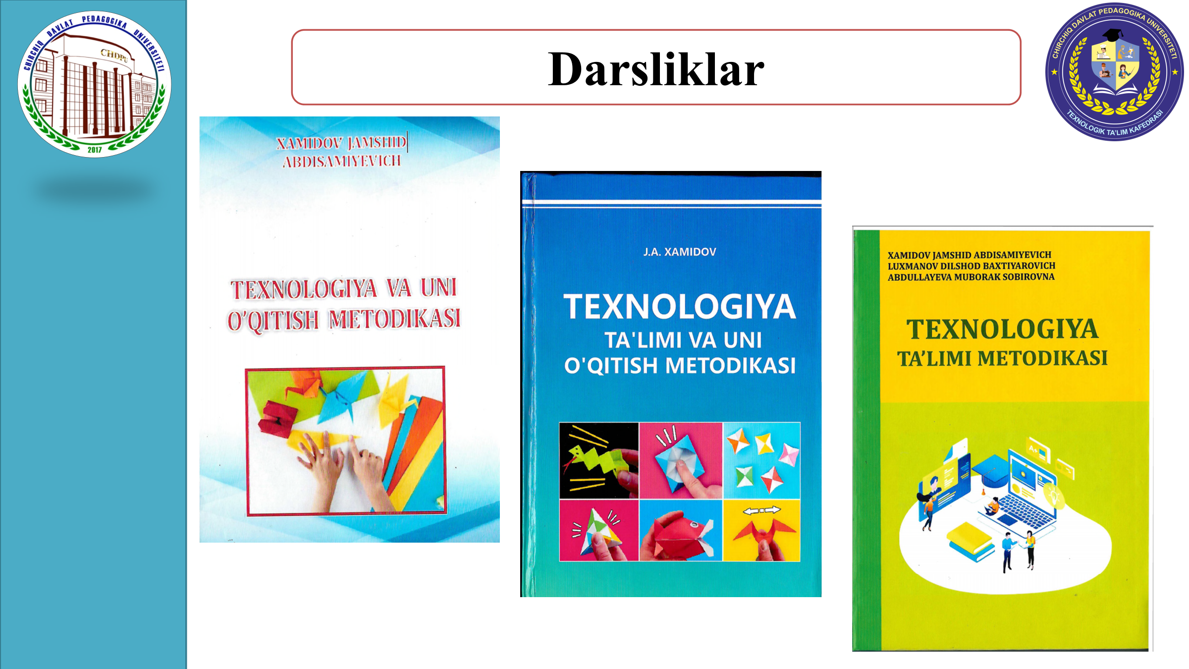 Xamidov J.A., Djalgashova K.Y., Nazarova S.O‘. Texnologik ta’lim o‘qituvchilarining kasbiy kompetentligini takomillashtirishda innovatsion texnologiyalarning roli va ahamiyati / Zamonaviy ta’lim va ma’naviy-axloqiy tarbiyaning dolzarb masalalari mavzusidagi xalqaro miqyosidagi ilmiy-amaliy konferensiyasi (17-oktyabr 2024 yil), 698-700 b.