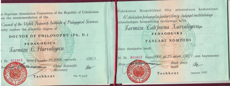 1.T.L.Xurvalieva 2008 yil 8 avgustda 13.00.01-Umumiy pedagogika, pedagogika va ta’lim tarixi ixtisosligi bo‘yicha “Maktab amaliyotchi-psixologlari malakasini oshirishda ilg‘or pedagogik texnologiyalardan foydalanish”) mavzusidagi pedagogika fanlari nomzodi dissertatsiyasini himoya qilgan.