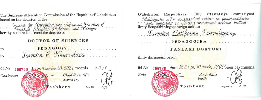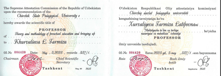 2023 yil 5 mayda “Maktabgacha ta’lim va tarbiya nazariyasi va metodikasi” ixtisosligi bo‘yicha professor unvonini olgan