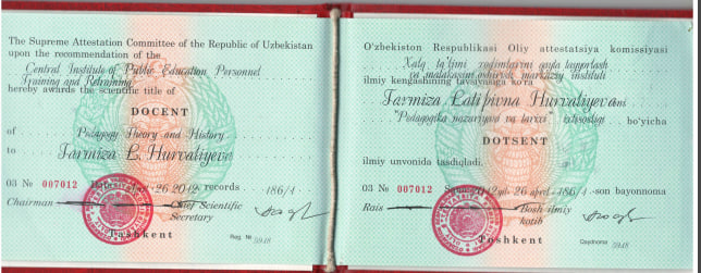 2.2012 yil 26 aprelda 186/1-sonli bayonnoma asosida, Umumiy pedagogika, pedagogika va ta’lim tarixi ixtisosligi bo‘yicha dotsent unvoni berilgan